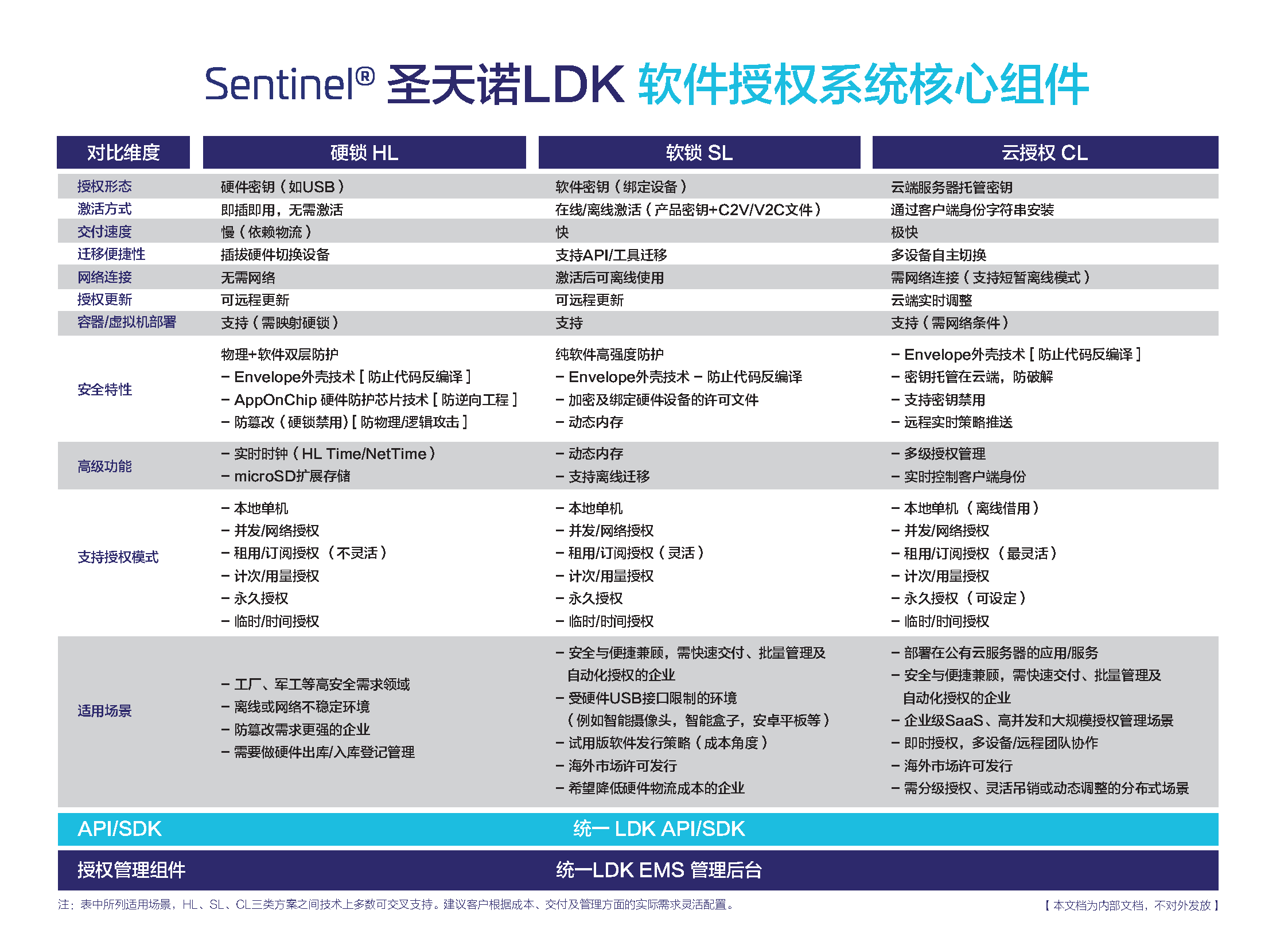 圣天诺LDK是一款即开即用的软件授权解决方案,融合硬锁授权(HL)、软锁授 权(SL) 和云授权(CL),为各类软件业务提供统一、灵活且高效的授权平台。无 论是永久式、订阅式还是按需授权,均可通过LDK实现灵活配置和高效管理。 所有授权形态都有统一的授权管理后台 (EMS) 和API 接口,帮助企业轻松扩展 业务、加速全球部署。